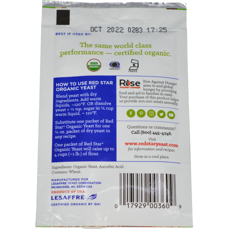 Red Star® Organic Instant Yeast is a baker’s dry yeast (Saccharomyces cerevisiae) vacuum-packed in foil pouches. The product is produced using ingredients that are approved for use in USDA NOP Organic Certified (95% Organic) products. The production process and products are certified by QAI to NOP and US/ Canada Organic Equivalency.